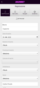 Per completare la registrazione su Daznbet, dovrete inserire il codice benvenuto DAZNBET50 ed effettuare un deposito minimo di 5€ entro 7 giorni. Si ricorda di verificare sempre i metodi di deposito accettati a fini dell’attivazione del bonus. Registrarsi su Daznbet è gratis!